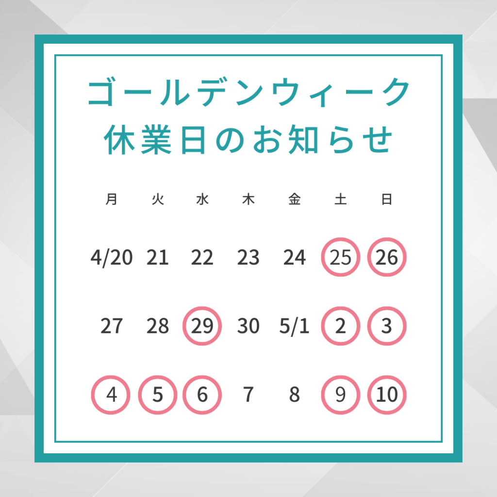 本年のゴールデンウィーク休暇についてお知らせ申し上げます。誠に勝手ながら下記日程の期間中はお休みとさせていただきます。お手数をかけいたしますが何卒宜しくお願い致します。 ゴールデンウィーク休暇期間・4月25日(土):休業・4月26日(日):休業... -